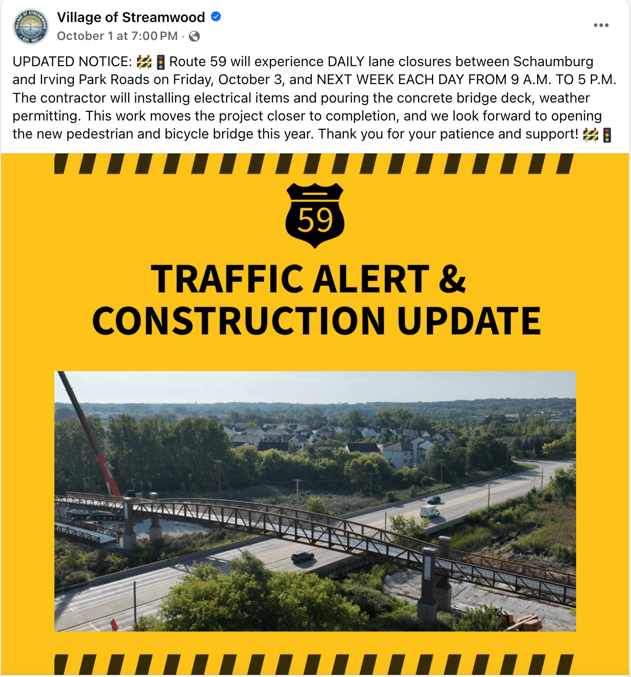 Hey, that bridge wasn't there a week ago! Actually, it was late Thursday or overnight Friday morning last week that the final trusses of the Streamwood bridge over Route 59 were put in place. The village posted about it, and then last weekend I rode out there to get a better look. It's a connection that west Streamwood residents have been waiting for all year. Check out my pictures of the progress and area trails. And that started a crazy-busy week of news in our bicycling world. To wit:...